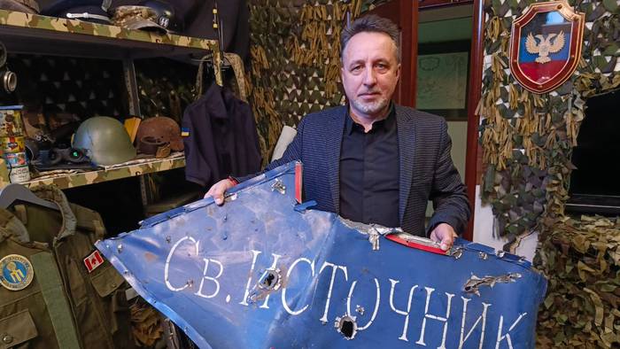Руководитель Благотворительного фонда «Руспомощь» Василий Александров показывает простреленный указатель, привезенный им с Донбасса в организованный музей отряда «Эспаньола» / Фото: Андрей Объедков