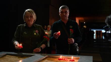 Родители погибшего участника СВО — Наталья и Игорь Кульневы ставят свечи в память о сыне и других бойцах в Зале Памяти и Скорби Музея Победы на Поклонной горе
