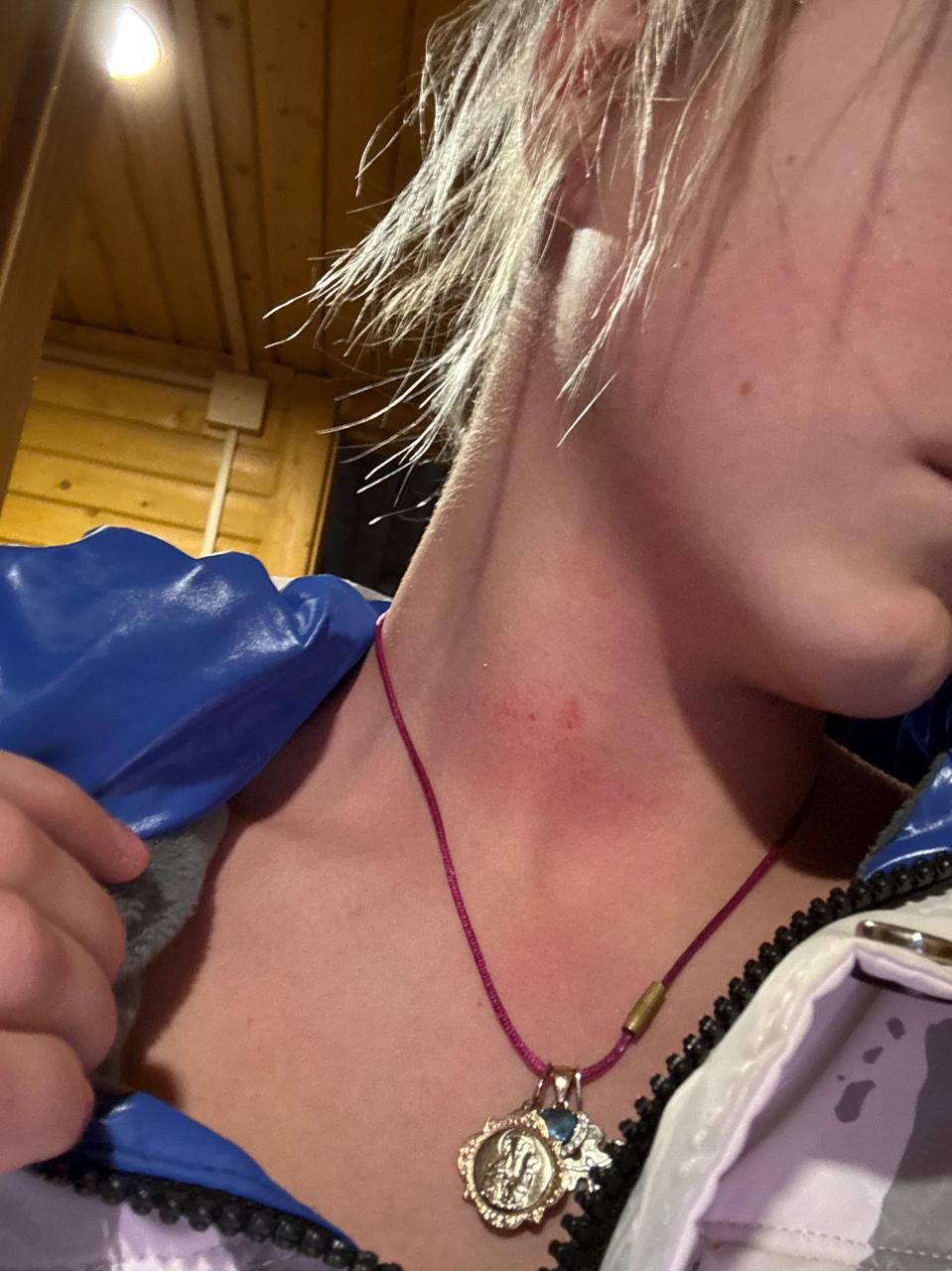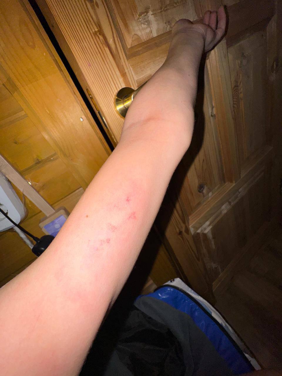 Следом директор «Ангелов Плющенко» опубликовала еще несколько фотографий, на которых Лена Костылева показывает травмы от побоев. У нее на шее видны красные пятна, а на руках — синяки.