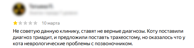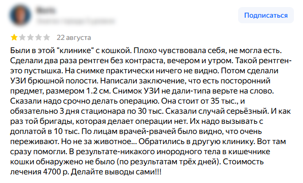 — Дерматолог не смогла отличить фолликулит от доброкачественной, но очень агрессивной кератоакантомы. Врачи и ассистенты будто бы вообще каждый раз берут кровь впервые. Боятся животных, впадают в истерику, если те дернутся. Не могут попасть в вену и заявляют, что вена плохая, хотя буквально вчера в другой клинике взяли кровь за две секунды. Другой врач определил пол кота как женский и нашел несуществующий шов от стерилизации. Он не смог определить, что это кастрированный кот, — возмутился один из клиентов.