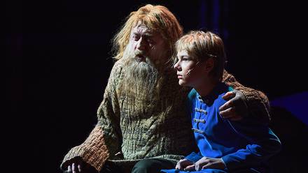 Отметим масштабную работу художника по свету Алексея Наумова. Его талант позволил с помощью трансляции образов на простые, казалось бы, декорации тонко дополнить действо. Вот ползут по стенам зеленые травы дикого леса, среди буйной зелени стоит волк, спустя минуты на стене — уже арочные окна храма, еще спустя миг — отблески костра или русские орнаменты.