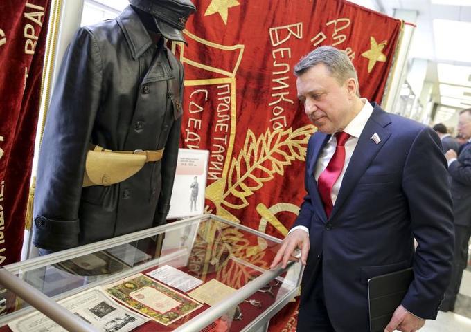 Член Комитета по безопасности и противодействию коррупции Анатолий Выборный изучает экспонаты выставки / Фото: Сайт Государственной думы ФС.РФ