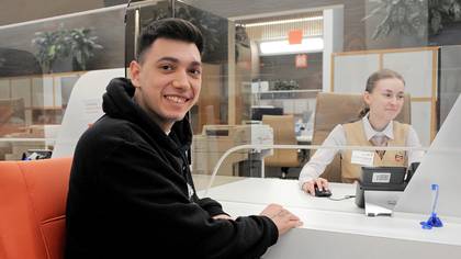 Специалист флагманского центра госуслуг САО Кристина Пищаева обслуживает москвича Никиту Дондцу / Фото: Пелагия Замятина / Вечерняя Москва