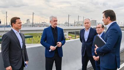 Слева направо: заммэра Максим Ликсутов, мэр Москвы Сергей Собянин, его заместители Андрей Бочкарев и Петр Бирюков и директор «Новой концессионной компании» Денис Янев осмотрели строящийся проспект Багратиона. Ввод этой магистрали повысил транспортную доступность международного делового центра «Москва-Сити» / Фото: Максим Мишин / Пресс-служба мэра и правительства Москвы