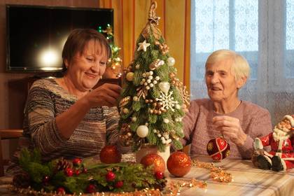 Социальный работник Надежда Чуйкова (слева) вместе со своей подопечной Надеждой Ивановной наряжает новогоднюю елку старинными игрушками / Фото: Департамент труда и социальной защиты населения Москвы