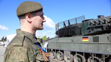 Участник специальной военной операции Руслан Путкарадзе демонстрирует немецкий танк Leopard 2A5, который наши бойцы захватили в апреле 2024 года на авдеевском направлении