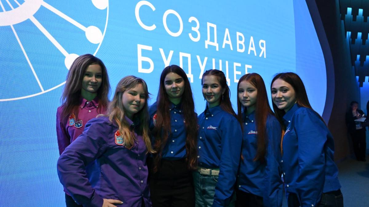 Участницы Второго международного симпозиума «Создавая будущее» из Подмосковья: Стефания Дюба, Валерия Гришина, Стефания Морозова, Валерия Пескова, Анна Лукинова, Александра Рыбина перед пленарным заседанием / Фото: Александр Кочубей / Вечерняя Москва