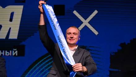 Президент Российского студенческого спортивного союза Сергей Крюков торжественно поднимает ленту, которая дает старт форуму «БУРЯ» / Фото: Анатолий Цымбалюк / Вечерняя Москва