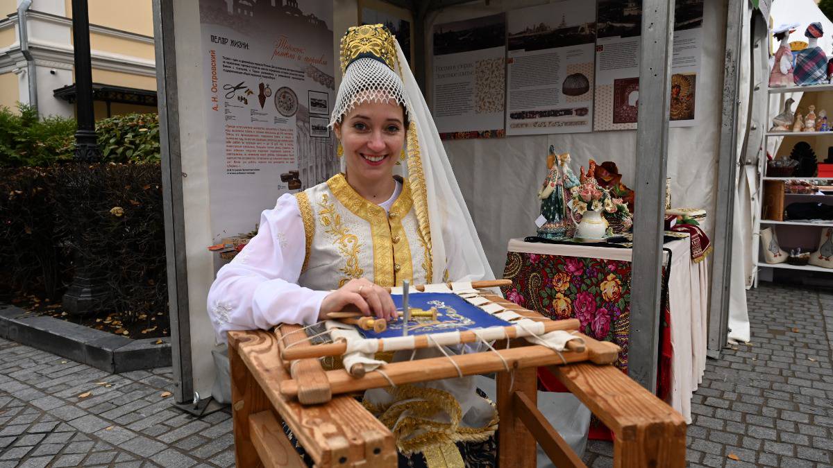 Мастер Торжокского педагогического колледжа, отделения золотного шитья и декоративно-прикладного искусства Татьяна Герасимова демонстрирует новоторжский кованый шов в рамках презентации малых городов России / Фото: Анатолий Цымбалюк / Вечерняя Москва