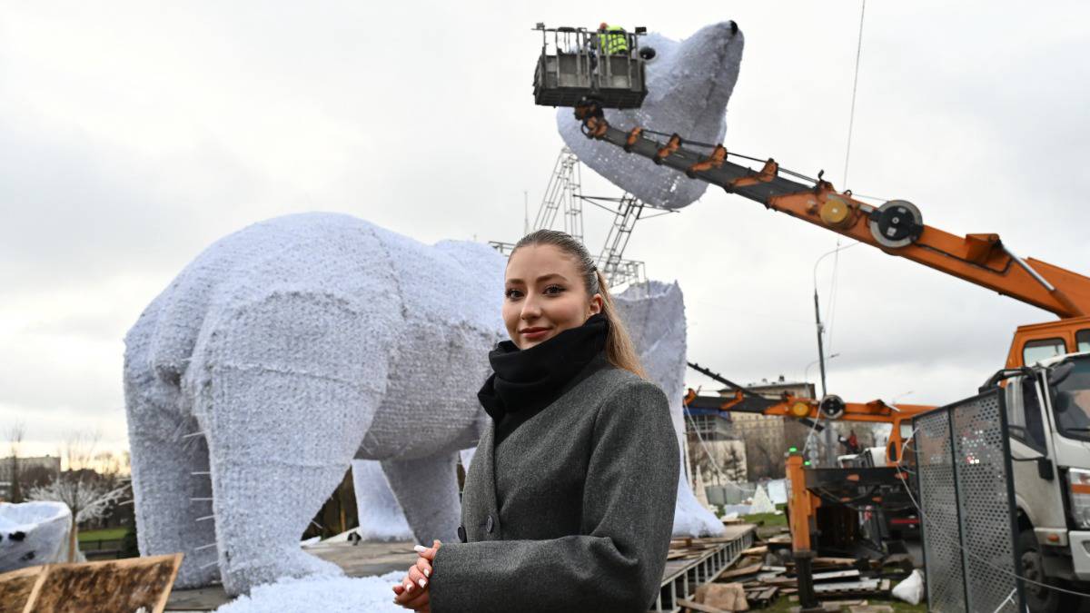Специалист, занимающийся монтажом конструкции «Полярные медведи», Анна Ильина показывает, как идут работы / Фото: Александр Кочубей / Вечерняя Москва