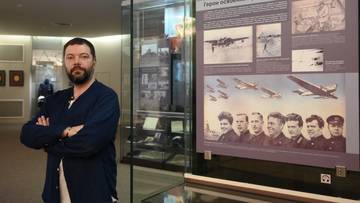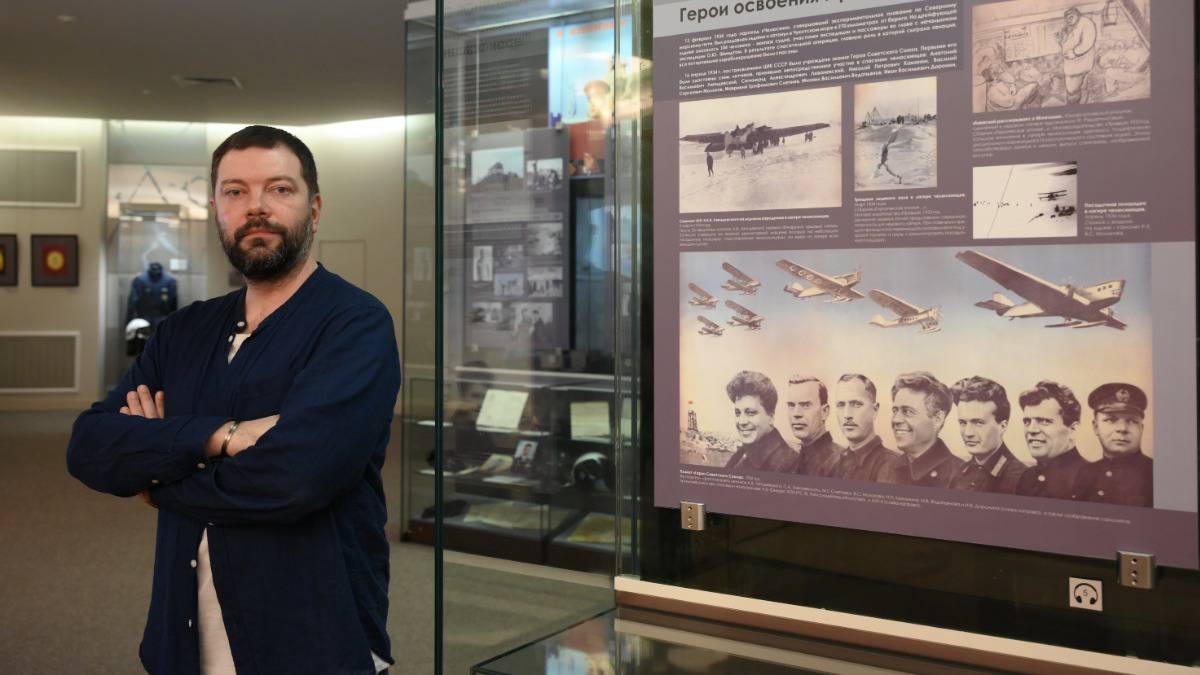Алексей Лучкин, заместитель директора Государственного музея обороны Москвы, в открывшемся после капитального ремонта обособленном отделе музея — Музее Героев Советского Союза и России. За его спиной — часть основной экспозиции, посвященная полярникам 1930-х годов / Фото: Пелагия Замятина / Вечерняя Москва