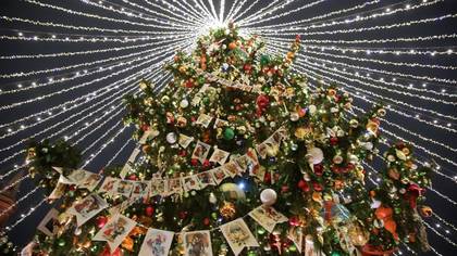 Огромная ель, украшенная шарами и гирляндами флажков с изображением советских открыток, красуется на Манежной площади / Фото: Артур Новосильцев / АГН Москва