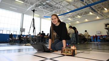 Ученица 11-го класса школы № 444 Анна Родионова настраивает своего робота во время практической части регионального этапа Всероссийской олимпиады школьников по робототехнике, которая проходила на площадке столичной школы № 548 на ЗИЛе / Фото: Анатолий Цымбалюк / Вечерняя Москва