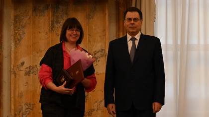 Аналитик отдела по взаимодействию с органами исполнительной власти ГБУ города Москвы «Управление спортивными объектами» Департамента спорта города Москвы Татьяна Романова и заместитель мэра Москвы при правительстве Москвы по вопросам региональной безопасности и информационной политики Александр Горбенко на церемонии вручения премий города Москвы в области физической культуры и спорта за 2025 год / Фото: Анатолий Цымбалюк / Вечерняя Москва