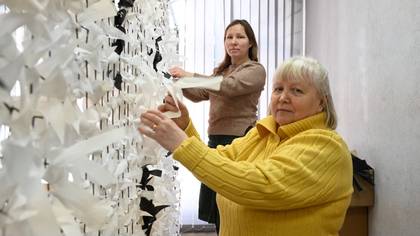 Волонтеры Корпуса поддержки Таганского детского фонда Надежда Антонова и Елена Морозова плетут маскировочную сеть белого цвета, предназначенную для зимнего сезона / Фото: Мария Хапцова / Вечерняя Москва