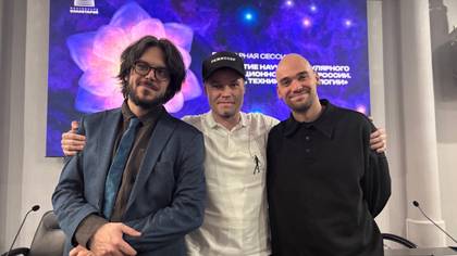 Ведущий художник компьютерной графики Марк Журавский, режиссер и автор сценария фильма «Эпоха звезд» Олег Гаврилин, аниматор Сергей Анфиногентов после премьеры в Московском планетарии / Фото: Василиса Чернявская / Вечерняя Москва