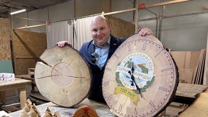 Исполнительный директор Московского областного отделения Всероссийского общества охраны природы Ярослав Вольпин показывает сувенир в виде настенных часов, которые сделали из Кремлевской новогодней ели / Фото: Анастасия Горанова