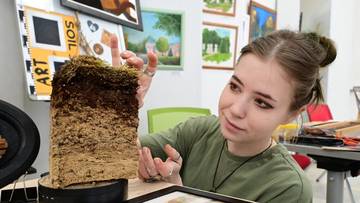 — Мы стараемся популяризировать почву и привлекать внимание к ней. Часто людей волнует то, что растет сверху, но именно здоровье земли напрямую влияет на качество растений. Кроме того, она может быть предметом искусства. Мы создали украшения с почвенными образцами в эпоксидной смоле и несколько картин из краски, которую тоже произвели сами, — поделилась аспирантка факультета почвоведения МГУ Мария Чепурнова.