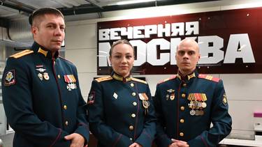 Командир группы разведывательного батальона младший лейтенант Иван Лексин, старший лейтенант медицинской службы Софья Дегтяренко и командир орудия гаубичного артиллерийского взвода сержант Дмитрий Вагнер в редакции газеты «Вечерняя Москва» / Фото: Мария Хапцова / Вечерняя Москва