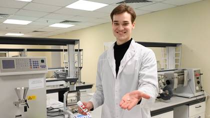 Студент 4-го курса Института имени Е. В. Боровского Сеченовского университета Андрей Галкин показывает свое изобретение — «умную» жвачку / Фото: Мария Хапцова / Вечерняя Москва
