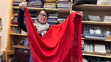 Соучредитель текстильного предприятия Елена Александрова показывает одну из ярких шалей, сотканных вручную