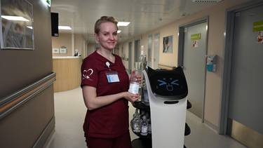 Старшая сестра отделения реанимации и интенсивной терапии новорожденных ГКБ № 67 Наталья Талькова нагружает робокошку бутылочками с физраствором — роботы помогают медикам выполнять рутинные задачи / Фото: Анатолий Цымбалюк / Вечерняя Москва