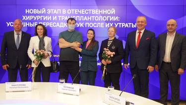 Директор НИИ скорой помощи имени Н. В. Склифосовского Сергей Петриков, главный внештатный специалист пластический хирург Минздрава РФ и Департамента здравоохранения Москвы Наталья Мантурова, пациент Роман с женой Натальей, глава Московского городского координационного центра органного донорства Боткинской больницы Марина Минина, директор Клиники пластической хирургии Валентин Шаробаро и заведующий научным отделением трансплантации почки и поджелудочной железы НИИ Склифосовского Аслан Балкаров на пресс-конференции, посвященной трансплантологии