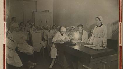 Эпизод из жизни московского эвакогоспиталя № 5800 (имена героев неизвестны). Собрания, на которых выступала Елена Сахарова у себя в поликлинике № 2 на Дербеневской, могли выглядеть именно так / Фото: Центральный государственный архив Москвы / Фонд Р-552, дело 62, лист 2