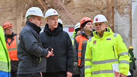 Мэр Москвы Сергей Собянин, председатель правления АО «Объединение «ИНГЕОКОМ» Дмитрий Евсеев и первый замгендиректора АО «Мосинжпроект» Сергей Жуков на выходе щита при строительстве станции «Бульвар Генерала Карбышева»