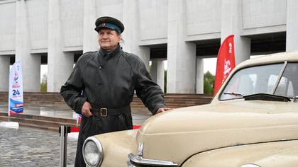 Участник автопробега Сергей Беда рядом со своей машиной ГАЗ-М-20 «Победа» около Музея Победы на Поклонной горе / Фото: Мария Хапцова / Вечерняя Москва