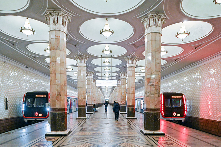 — Обладавший чутьем Чечулин понимал, чего хочет партия. Она желала «освоения мирового наследия в архитектуре и строительстве с учетом наших социальных завоеваний». Сорок шесть колонн, обрамляющих перронный зал станции, призывали к движению вперед, три ряда ниш со светильниками рождали иллюзию высокого неба. Очевидно, что Чечулин мог себе позволить дорогостоящие материалы, раз одел несущие элементы в розовый и бледно-зеленый оникс, который, правда, быстро потрескался и был заменен на светлый мрамор.