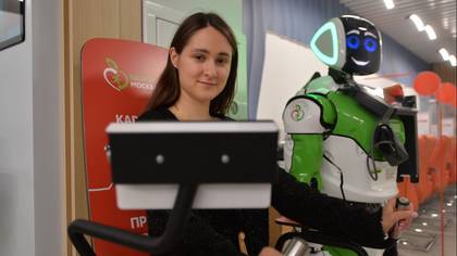 Рядом с диагностическим комплексом установлен специальный робот-диагност. Кроме прочего, он может быстро измерить уровень сахара в крови благодаря встроенному глюкометру. А еще робот может измерить температуру тела человека бесконтактным способом и даже провести частичное обследование организма.