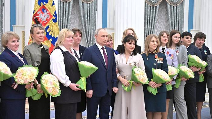 В Екатерининском зале Кремля награды получили военные корреспонденты, учителя, работницы культуры и производства. Глава государства подчеркнул важность женщин в жизни России.