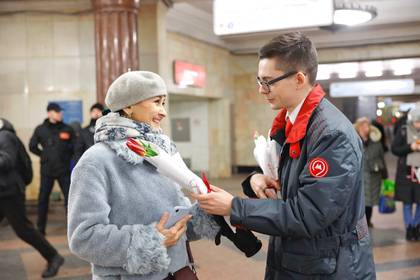 Более 20 тысяч тюльпанов подарили пассажиркам в метро Москвы
