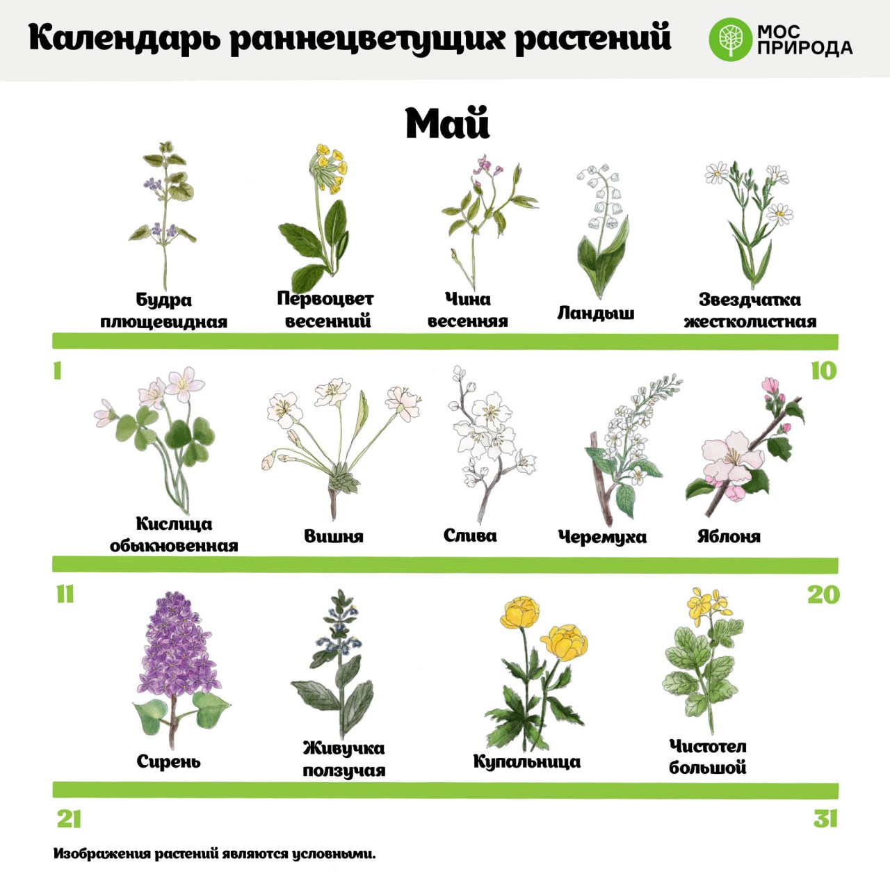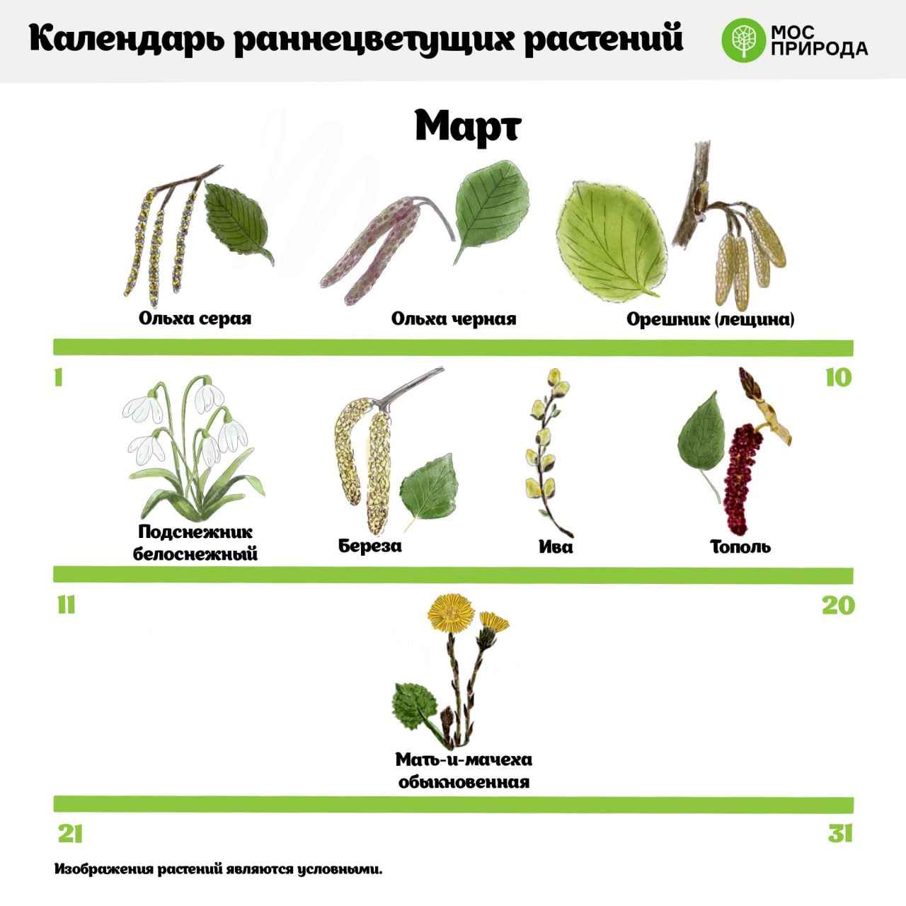 Так, в марте начинают цвести орешник, ольха, ива, подснежник, мать-и-мачеха; в апреле — медуница неясная, пролеска сибирская, фиалка опушенная, волчье лыко обыкновенное; в мае — цветки вишни, яблони, сирени, ландыша майского и чины весенней.