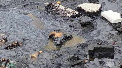 Собаку нашли в луже мазута по слабому скулежу. Животное почти утонуло — на поверхности виднелись только один глаз, ухо и кончик носа. Чтобы спасти собаку, специалисты проложили к ней путь по деревянным доскам, которых было много вокруг, так как инцидент произошел на территории бывшего завода.