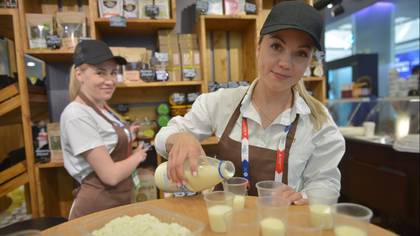 Продавцы магазина фермерских продуктов из Иванова Оксана Заботина (слева) и Алена Фадина угощают продукцией гостей форума «Неделя российского ретейла» — 2023. Их компания планирует вскоре выйти на столичный рынок. И это бизнес-мероприятие — отличный шанс найти новых партнеров / Фото: Наталья Феоктистова / Вечерняя Москва