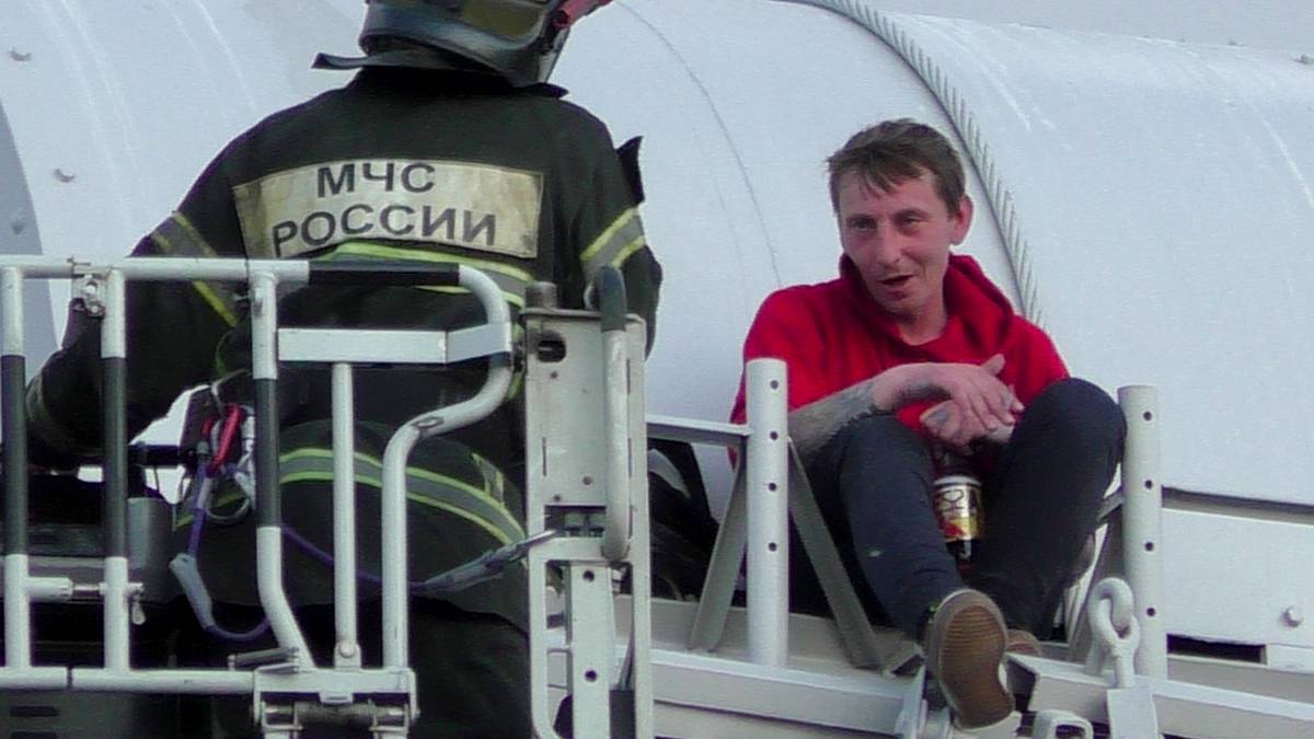 Он размахивал руками, бросал пустые бутылки из-под алкоголя и требовал что-то невнятное. Прибывшие спасатели с психологами, поднялись на пожарной лестнице к мужчине и сняли его.