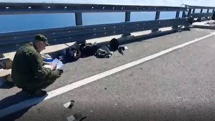 Также в Сети появились кадры повреждений Крымского моста. На них видны поврежденные пролеты моста, при этом опоры остались целыми.
