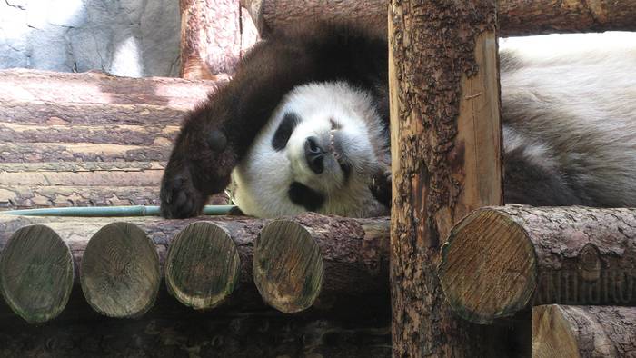 Пресс-служба Московского зоопарка в понедельник, 17 июля, поделилась кадрами, на которых панда Жуи пытается справиться с вернувшейся в столицу летней жарой.