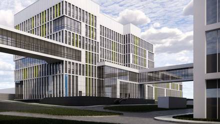 Новое здание лучевого корпуса будет шестиэтажным. Здесь разместятся отделения радиотерапии, внутриполостной терапии, дневной стационар для оказания радиотерапевтического лечения, радиологический блок, блоки томометрии, радионуклидного обеспечения, радиологических исследований, административно-хозяйственные помещения.