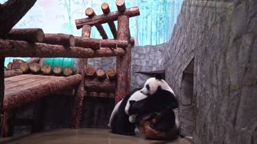 На кадрах панды весело играют, заваливаясь друг на друга. При этом сразу можно заметить, как быстро подружились животные, которых меньше недели назад поместили под одну крышу.