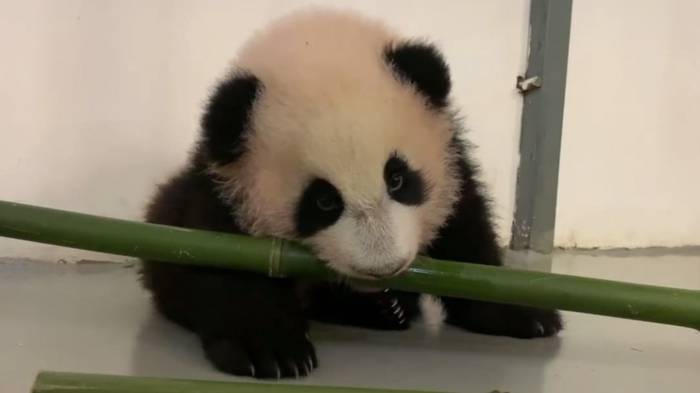На опубликованных кадрах виден уже повзрослевший детеныш большой панды, который пытается грызть свежий стебель бамбука. Однако в силу возраста у малышки пока не получается.