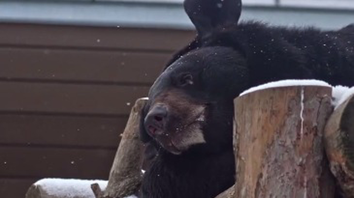 На видеозаписи мохнатый скучающе лежит в своем вольере на бревнах, ловя небольшие снежинки и словно предчувствуя запах грядущего похолодания.