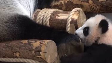 Малышка-панда Катюша начинает проявлять свой характер и упрямство. Кадрами борьбы детеныша за место на деревянной лестнице в субботу, 20 января, поделилась генеральный директор Московского зоопарка Светлана Акулова.