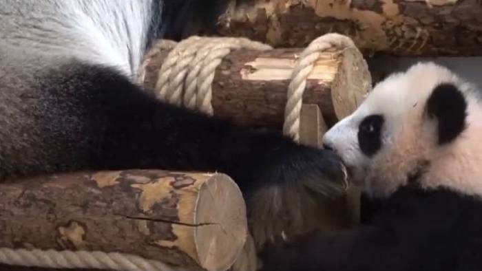 Также Светлана Акулова опубликовала видео, на котором мама-панда Диндин приглашает свою дочь Катюшу выйти из неэкспозиционного вольера и переместиться в большой. Катюша постаралась подняться по огромной для нее лестнице, но не удержалась и сорвалась. Панда заботливо придержала Катюшу.