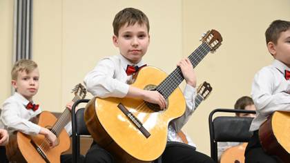 В большом концертном зале идет репетиция ансамбля гитаристов «Саунд лайф» под руководством победителя регионального этапа общероссийского конкурса «Лучший преподаватель детской школы искусств», преподавателя по классу гитары Александры Головинской. Даже репетиция — зрелище яркое: около 20 юных гитаристов играют на сцене одновременно. В их числе — школьник Матвей Кожинов, который занимается гитарой уже шесть лет.