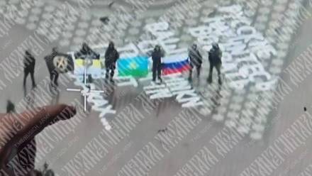 На опубликованных кадрах видно большую надпись «Русские, научитесь воевать», которая, вероятно, была сделана неподалеку от здания местной администрации.