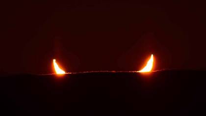 Он поймал это явление на камеру в Монтичелло (Штат Мэн). На кадрах видно, что Луна закрывает Солнце на 95 процентов. При этом спутник Земли успел оставить на горизонте алые рога.