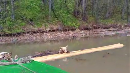 Медведица с детенышем переплывала водную преграду, но в какой-то момент у малыша кончились силы, и он стал тонуть. Медвежонок зацепился за ствол упавшего дерева, но выбраться на твердую почву уже не мог.